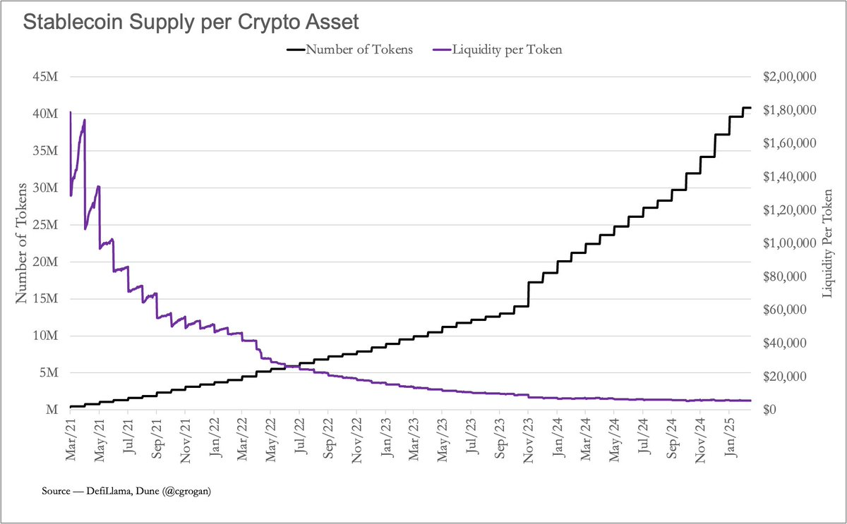 在 2021 年,每种加密资产平均拥有约 180 万美元的稳定币流动性。而到了 2025 年 3 月,这一数字已锐减至仅 5,500 美元。