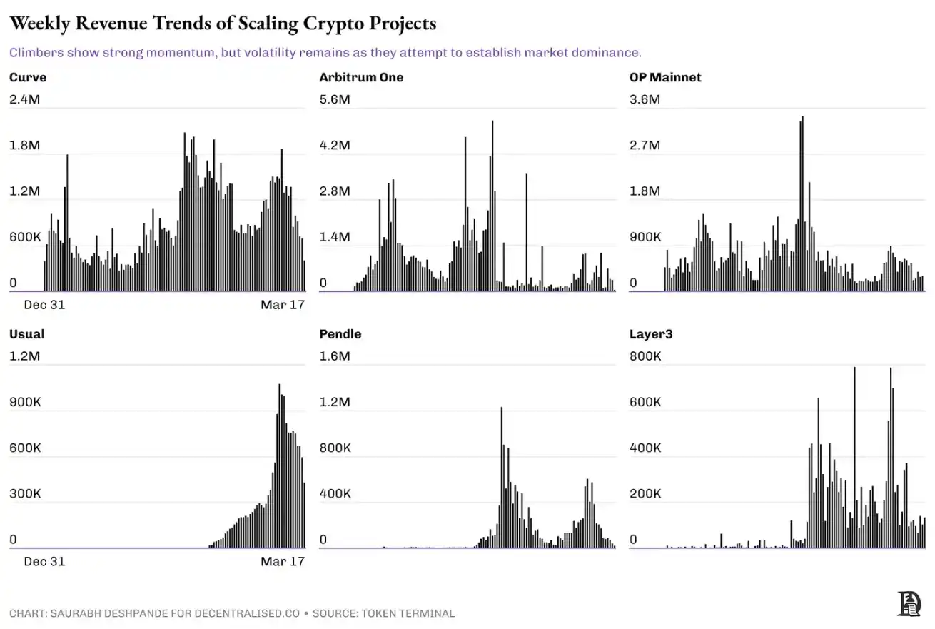 像 Curve 和 Arbitrum One 等项目,营收流较为稳定,有明显的高峰和低谷,这表明受市场周期和激励措施影响而出现波动。OP Mainnet 也呈现类似趋势,激增表明需求旺盛期,随后就会放缓。与此同时,Usual 的营收呈指数级增长,这表明其被迅速采用,但缺乏历史数据来确认这种增长是否可持续。Pendle 和 Layer3 的活跃度出现大幅飙升,表明当前是用户参与度较高的时刻,但也揭示了长期保持发展势头的挑战。