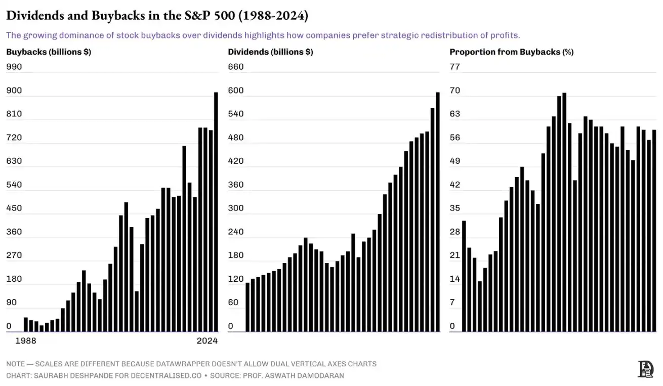 20 世纪 90 年代初,只有约 20% 的利润通过回购分配。到了 2024 年,约 60% 的利润分配是通过回购进行分配的。按美元计算,回购在 1999 年超过股息派发,此后一直保持领先。