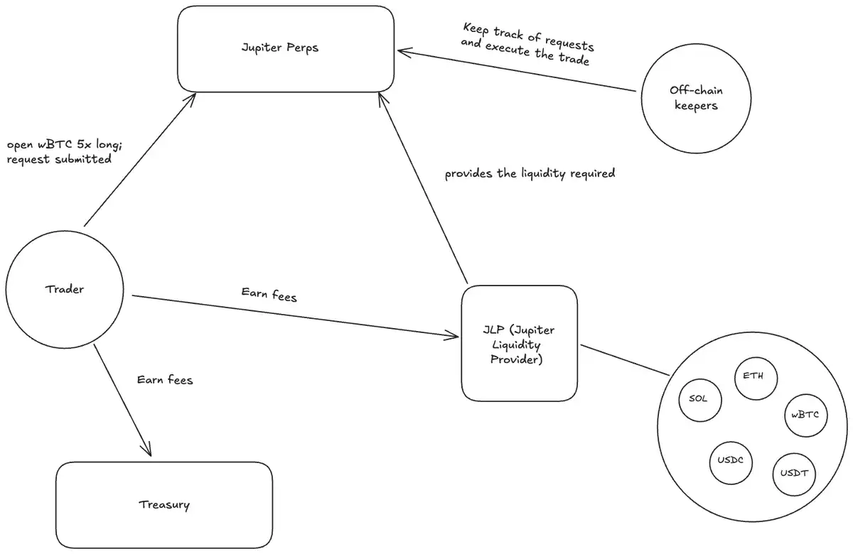 与 GMX-Solana 类似,Jupiter 采用池子模式(pool-based design),即流动性池作为交易者的对手方。在这种设计下,当交易者亏损时,流动性池盈利;反之亦然。