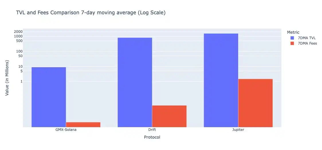 GMX-Solana 的这一数值为 0.0002,Jupiter 为 0.00097,Drift 为 0.00003。