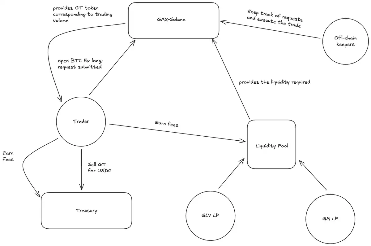 GMX-Solana 是 GMX V2 的一个略微修改版本,专门为 Solana 区块链优化。用户可以进行杠杆交易、提供流动性以及兑换代币。其上线时引入了一个独特功能——交易即铸造(Trade-to-Mint)模式,交易者根据支付的交易手续费获得 GT 代币。这些 GT 代币可以通过金库兑换为稳定币,从而抵消用户的交易成本。