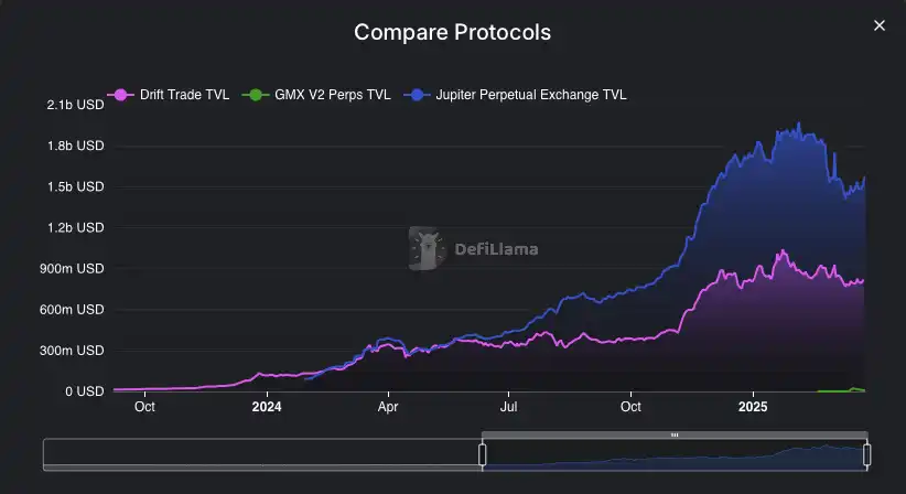 Drift 也是 Solana 上最大的链上永续合约交易所之一。自 V2 版本上线以来,该平台的 TVL 已接近 9 亿美元,总交易量达 592 亿美元。