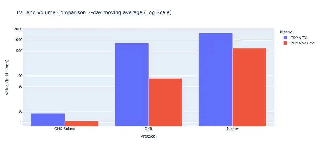 Jupiter 和 Drift 展示了持续的增长模式,但缺乏资本效率。虽然 GMX-Solana 在资本效率方面稍有优势,部分原因是流动性较低,但仍需努力追赶。