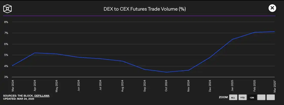 链上衍生品市场空前繁荣,协议之间的竞争日益激烈,推出了许多出色的产品。DEX 到 CEX 的交易量比率正在上升,目前约为 7%,这意味着未来还有很大的增长空间。
