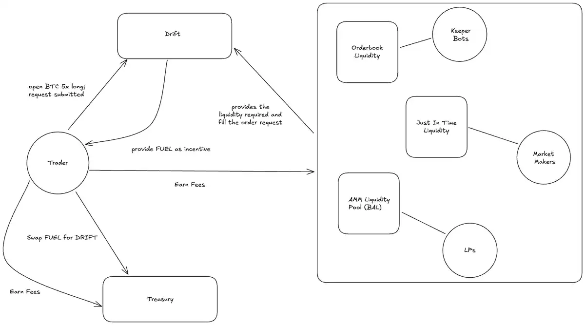 Drift 采用混合模式(Hybrid Design),通过多个渠道获取流动性,以确保高效交易执行、深度流动性以及合适的盈亏结算机制。