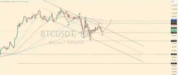 2、如果把从 109000→76000 的下跌看做是整个下跌的第一阶段的话,认为 76000 至今的反弹是没有走完整的,如图所示: