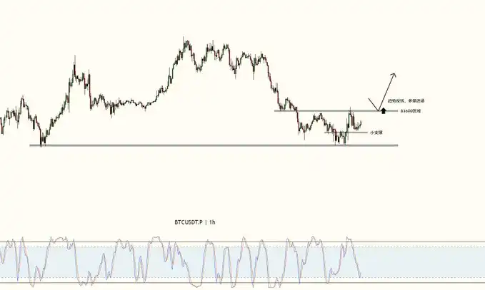 目前 1H 整体还是个下跌箱体,但箱体中有个短期结构的反转,配合指标上穿,先重新看向 83600 区域,观察继续受阻的情况。