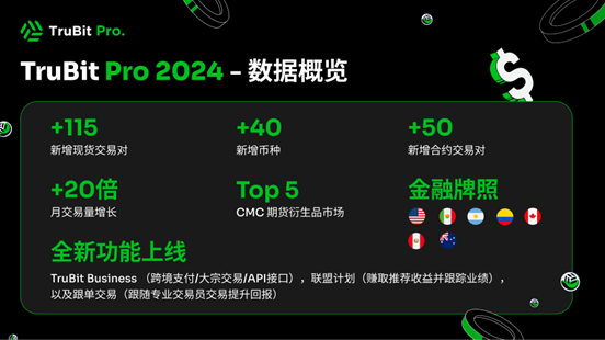 2024 年无疑是加密货币行业迈向主流的重要一年,比特币 ETF 的推出和美国总统特朗普的当选加速了行业机构化与合规化进程,比特币价格也历史性突破了 10 万美元。TruBit Pro 作为领先的数字资产交易平台,在全球市场也取得了突破性进展,获得多国金融合规认证,持续扩大监管覆盖范围,为广大用户提供安全、透明的交易环境。