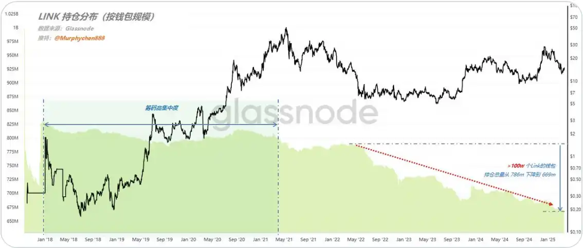 从当前流通筹码持仓分布来看,巨鲸们(>100w 个)所持有的 Link 正在不断下降。在 22 年 5 月熊市持有 786m 个 Link,直到 25 年 3 月该数字已经下降到了 669m。这说明更多的 Link 正在向相对较小的钱包转移,也就是筹码集中度正在下降。