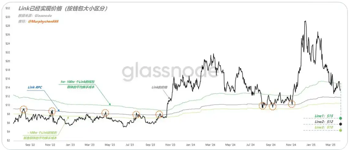 在 24 年 8 月到 11 月期间,Link 也经历了漫长的牛市回调期。可以看到价格始终保持在 Line3 以上,即每当触及鲸鱼群体的成本线时,抛压就会减少。因此,如果我们假设本轮牛市还未结束,那么当 Link 的价格低于 Link-RPC 高于 Line3 时,或许就是回调的极限($10-$12)。