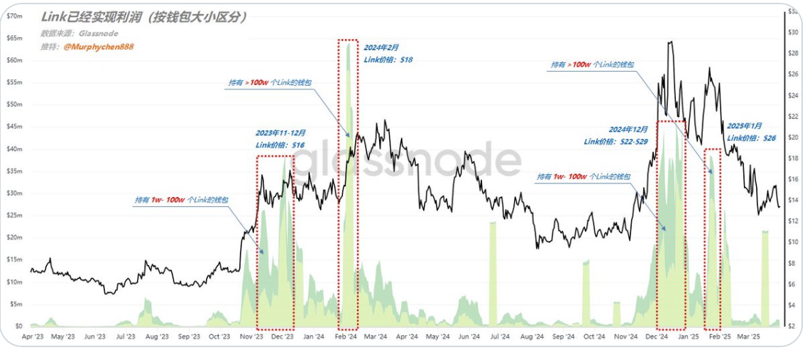 如图 1 所示,每次当 Link 价格快速拉升后,持有 1w-100w 个 Link 的钱包(高净值群体)和持有>100w 个 Link 的钱包(鲸鱼群体)都出了非常高的已实现利润的峰值。而且每次大级别趋势中都是 1w-100w 的群体先出现大量抛售,然后才是>100w 的群体开始套现,不久便价格见顶开始回落。