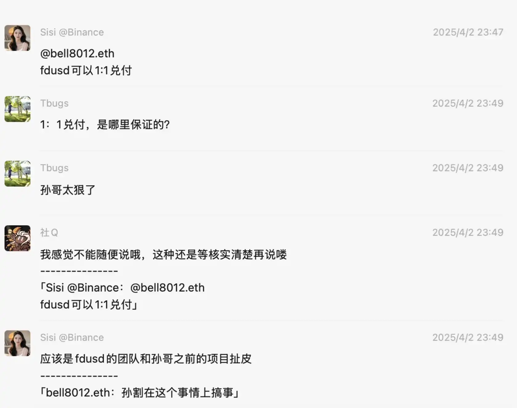 当然 Wintermute 只是在用 FDUSD 套利,其行为并不能引起 FDUSD 反弹,用户最期待的还是 Binance 的发声。Binance Sisi 首先在某群里表示,FDUSD 可以 1: 1 对付,Justin Sun 的发帖可能是因为 FDT 和 Justin Sun 之前项目之间的一些 beef。