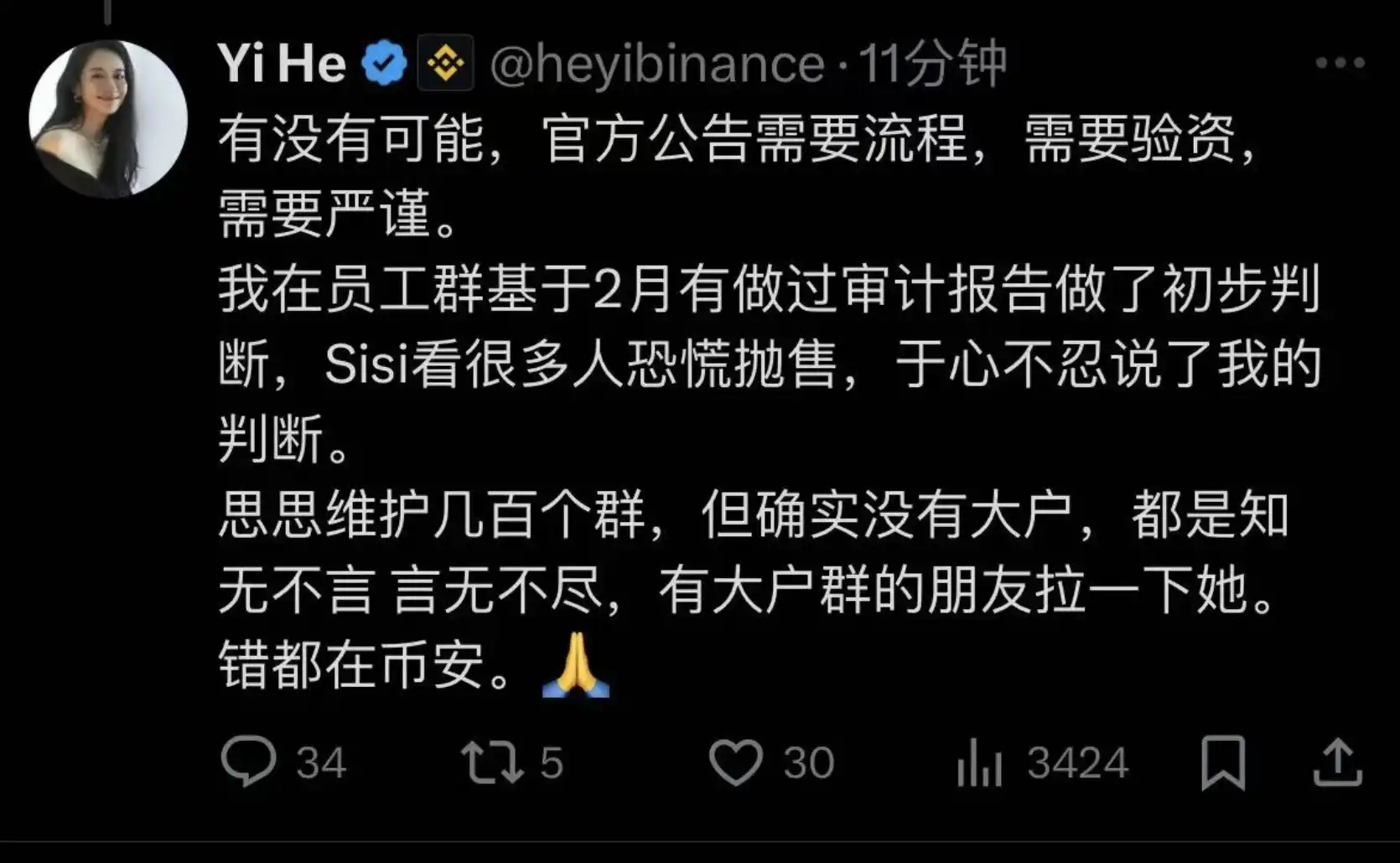 对此 Binance 联创何一发文表示,FDUSD 的官方公告是需要流程的,需要验资和时间,Binance Sisi 只是在群里看到一些人恐慌性抛售于心不忍才说出了 FDUSD 可以 1: 1 兑付的判断。