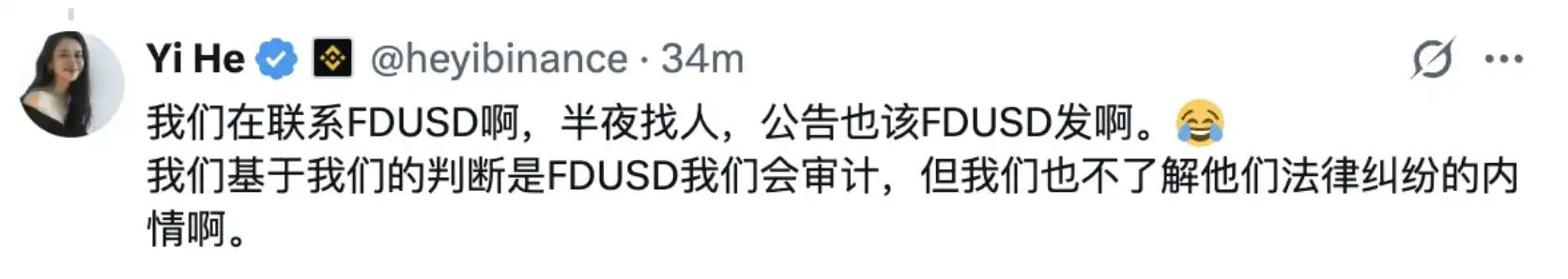随后 Binance 联创何一也在 X 上发文表示:「该事件是因为 Justin Sun 和 TUSD 打官司,不是 FDUSD。」