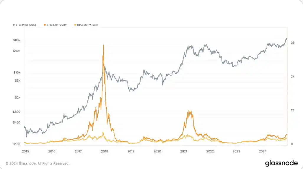 MVRV 与 LTH-MVRV 的比较,橘色线是 LTH-MVRV,黄色线是 MVRV