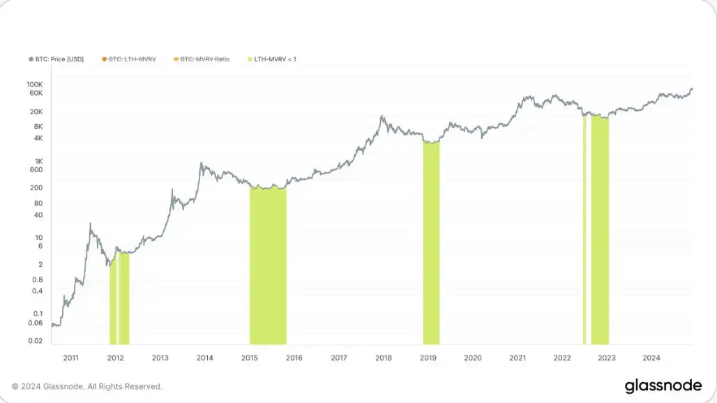 当 LTH-MVRV < 1(或者说市价低于 LTH-RP)时,代表就连长期持有者平均都是亏钱的,通常这种时候就是一个不错的抄底时机。