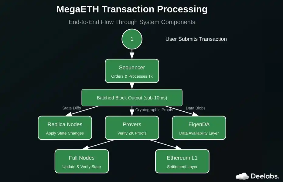 在 MegaETH 网络中,交易从排序器到最终确认的过程经过多个环节,每个组件都承担着特定的职责,确保区块链的高效运行。