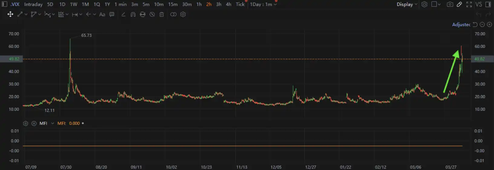 这场乌龙并非孤立事件。上周,特朗普宣布「世纪最严贸易壁垒」后,标普 500 指数已较 2 月 19 日的历史高点下跌 20%,市值蒸发约 9.5 万亿美元,跌幅之快在 1945 年以来 14 次熊市中排名第二。华尔街恐慌指标——芝加哥期权交易所波动率指数(VIX),上周五收于 45 后,周一隔夜飙升至 60,远超 20 的长期均值,显示市场恐慌已达顶点。