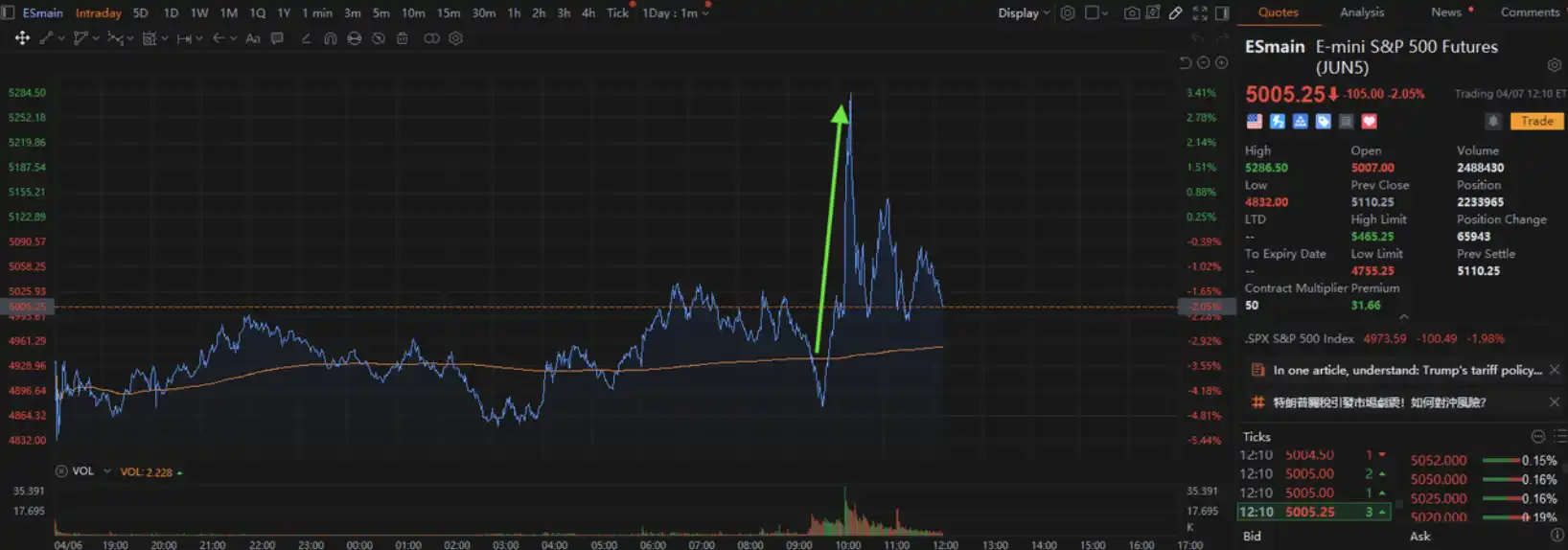 周一美股开盘,市场本已风雨飘摇。特朗普此前对主要贸易伙伴祭出的高关税壁垒,将标普 500 指数(SPY)推入自新冠疫情以来的首次熊市。根据实时数据,标普 500 指数(SPY)当日开盘价为 489.19 美元,却在早盘一度跌至 483.122 美元的年内低点。然而,当「关税暂停」传言传出,10 点 15 分,SPY 飙升至 512.155 美元,市值激增。然而,澄清消息一出,到 10 点 45 分,SPY 回落至 504.19 美元,投资者眼睁睁看着万亿财富蒸发。