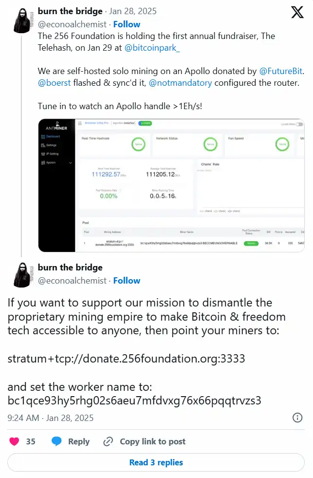 如今,一些像 Bitaxe 和 FutureBit Apollo 等售价在 200 到 500 美元之间的业余挖矿设备,正在受到比特币极端主义者的青睐。今年 1 月,一台 FutureBit Apollo 成功挖出一个区块——不过这是在一个非营利组织向其捐赠了算力的前提之下。匿名矿工 Econoalchemist 当时在 X 上写道该组织的目标是「打破专有矿业帝国,让比特币和自由技术变得人人可用」。