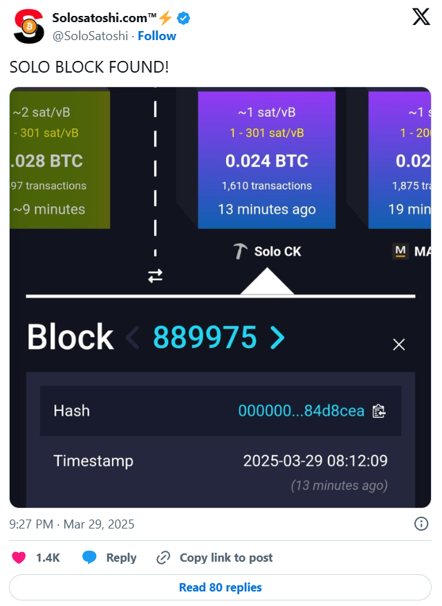 Optiminer 的 Norris 补充指出,其实也可能是某些大型机构在不接入大矿池的情况下,用自己的算力挖出了区块——形式上看似「独立」,但实际并不是个体行为。