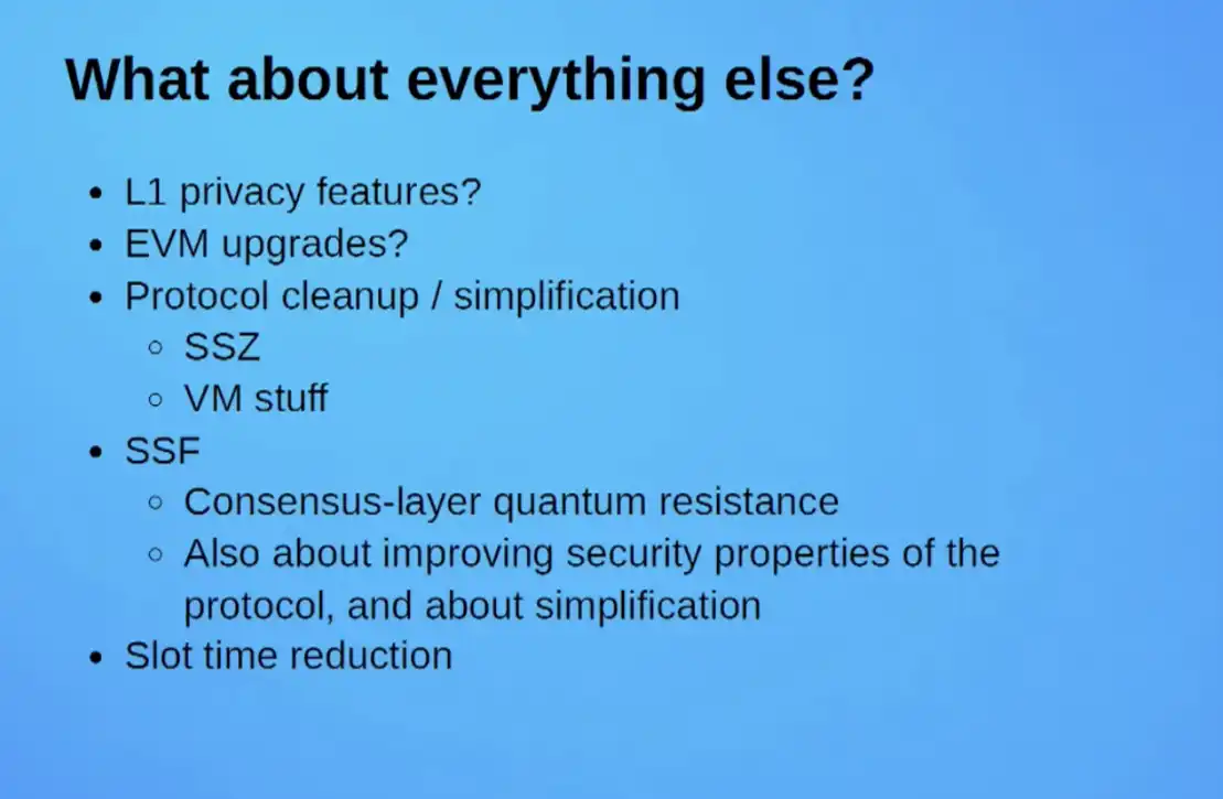 在其他方面,以太坊同样在 L1 隐私功能强化、EVM 升级、协议清理 / 简化、共识层量子抗性提升、协议安全属性与简化性优化,以及 Slot 时间缩减等领域积极探索。