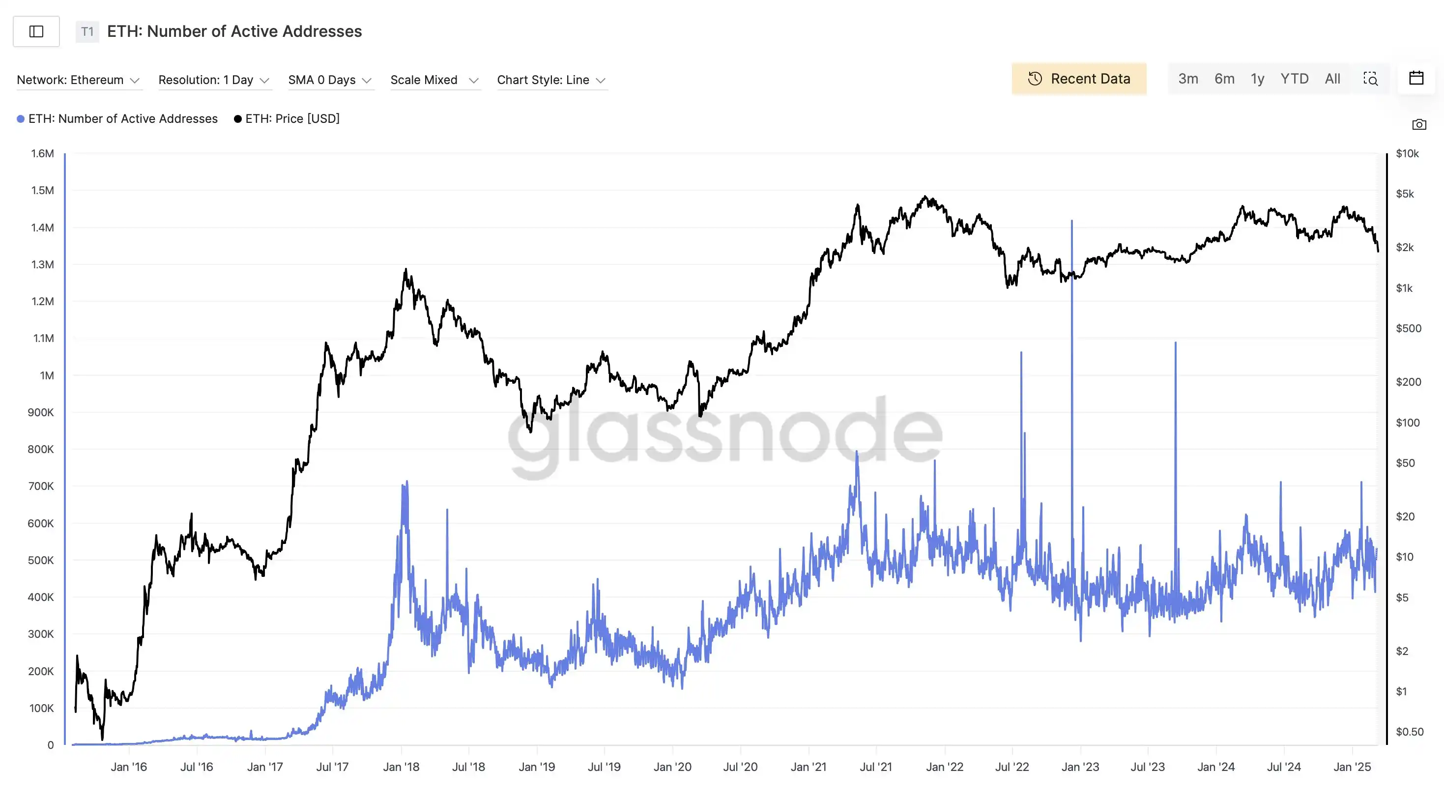 以太坊的基本面近年来似乎正经历一场静悄悄的变迁,而这可能正是大户对 ETH 前景转而悲观的重要原因。Glassnode 数据显示,过去四年,以太坊的活跃地址数量几乎停滞不前,始终徘徊在同一水平线,未能随着市场热潮显著增长。这并非技术优化的「效率区间」,而更像是增长动能的枯竭,显示出以太坊在吸引新用户和开发者方面的疲态。
