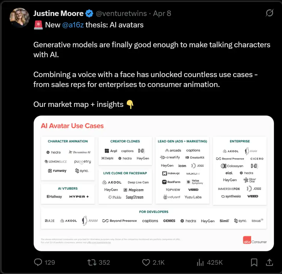 像 YC(Y Combinator)孵化的一些公司在疯狂推出垂直领域的 AI agent;a16z(Andreessen Horowitz)也在通过各种投资论点布局未来的消费级 AI 潮流;Perplexity AI 最近还推出了自己的 AI 基金,直接加码 AI 赛道。