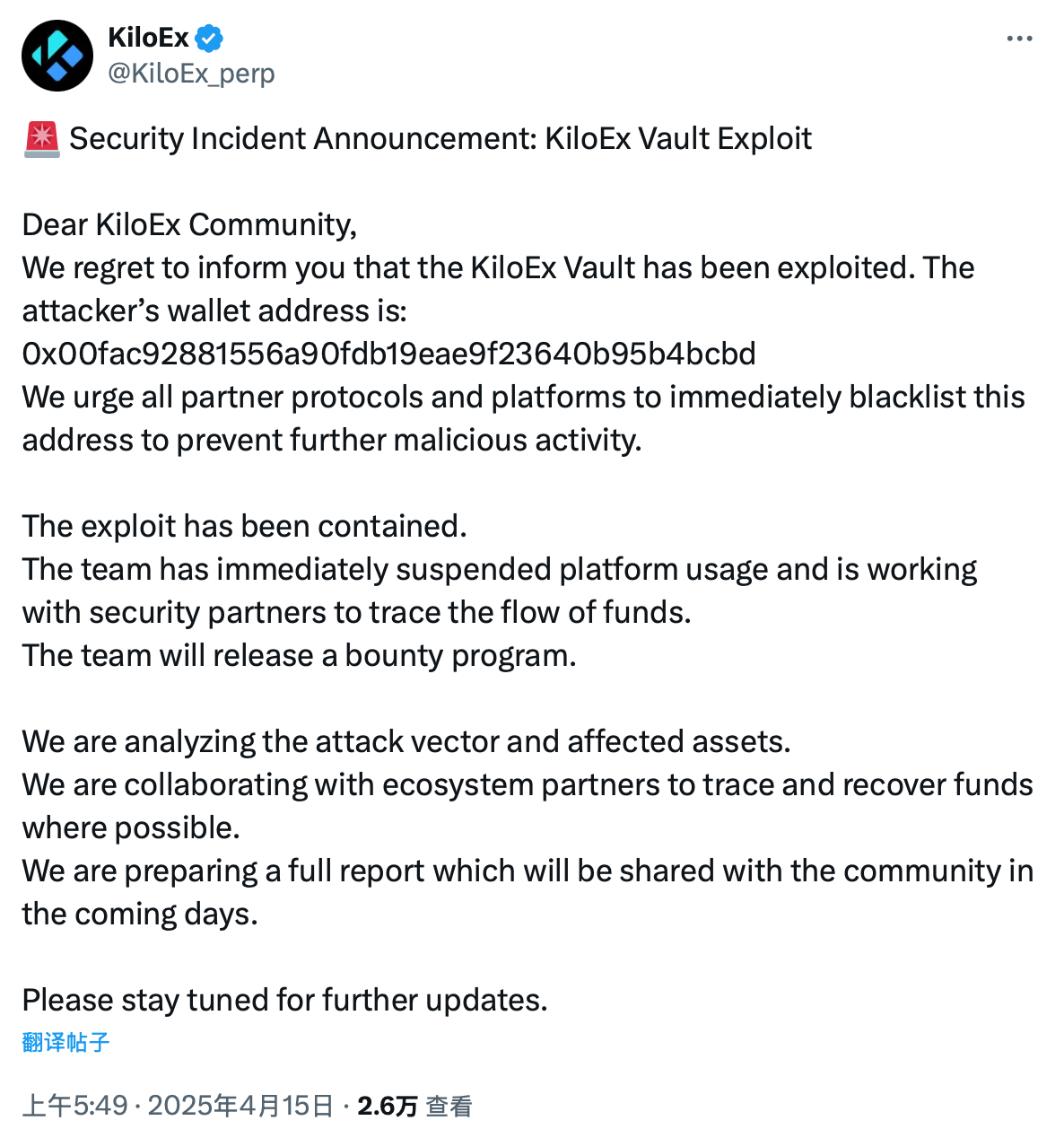 4 月 15 日凌晨,曾在此前获 YZi Labs 投资的链上永续平台 KiloEx 在其官方 X 账号发出一则公告,表示其协议金库 KiloEx Vault 遭遇黑客攻击,且目前漏洞攻击已得以控制。