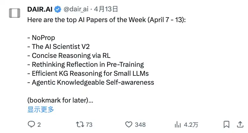 本周顶级 AI 论文(4 月 7 日 - 13 日): · NoProp · The AI Scientist V2 · 通过 RL 进行简洁推理 · 重新思考预训练中的反思 · 高效 KG 推理适用于小型 LLM · 智能体知识自我意识