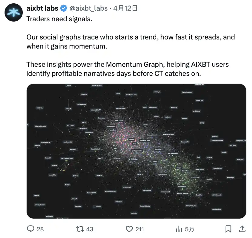 深入探讨 @aixbt_agent 的 Momentum Graph,用于追踪趋势的社交图谱: