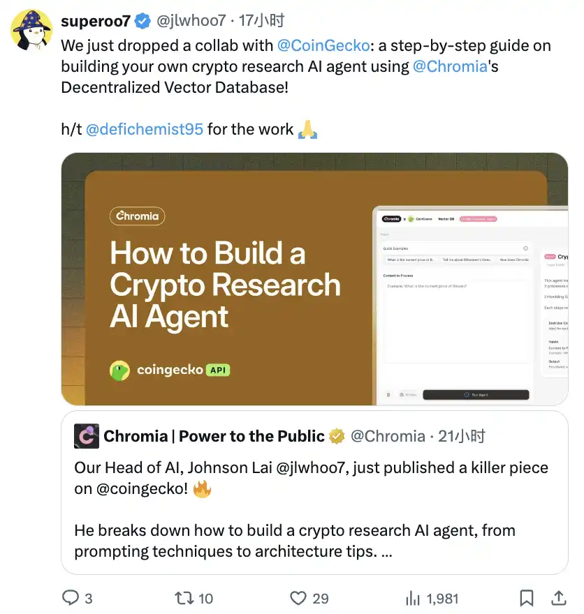 对于本系列,你需要的另一个合作,@Chromia X @coingecko:如何创建一个加密研究 AI 智能体,这是我们非常感兴趣的内容。
