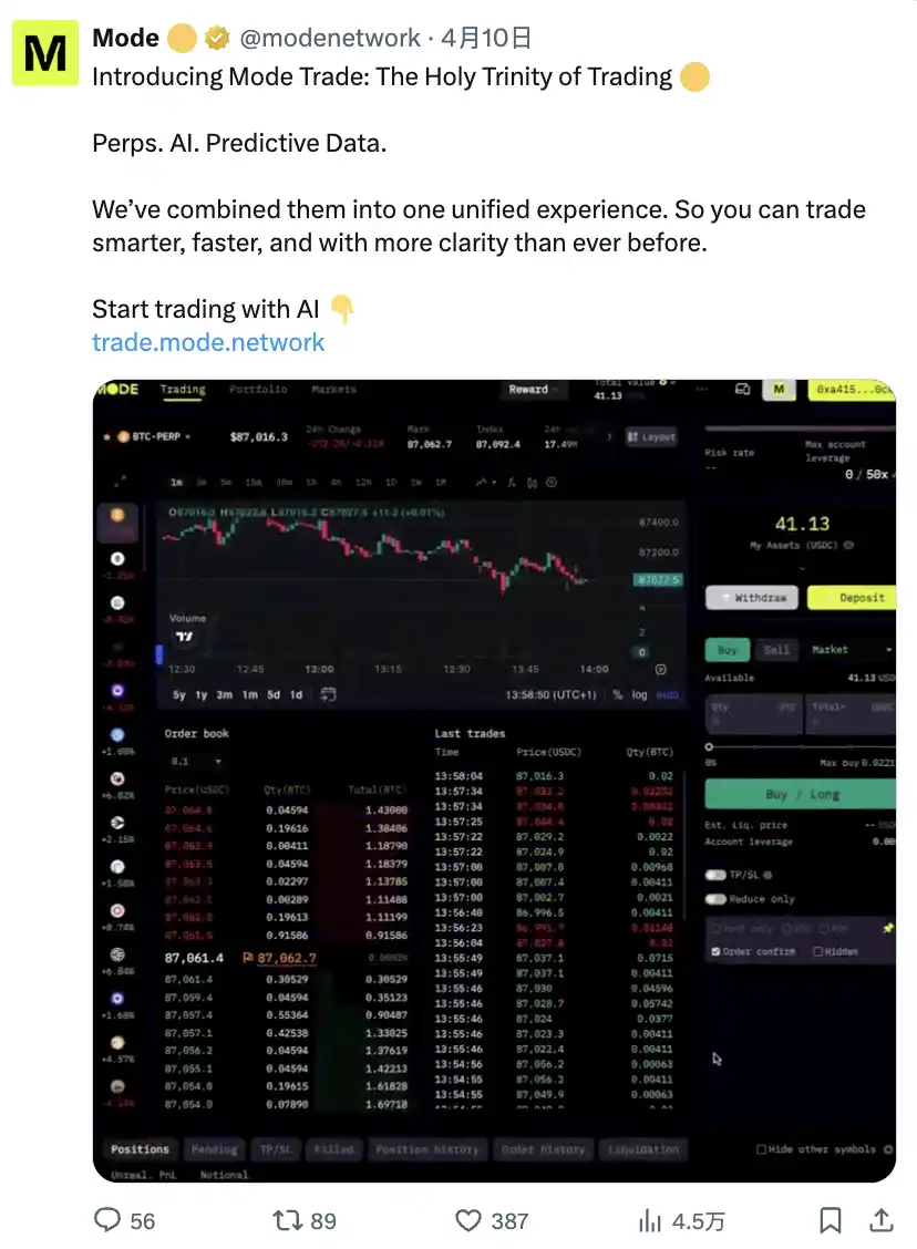 Mode Trade 圣三位一体整合了:强大的永续合约引擎、简化执行的 AI、提升策略的预测数据 下一代交易不仅仅关乎速度,而是智能