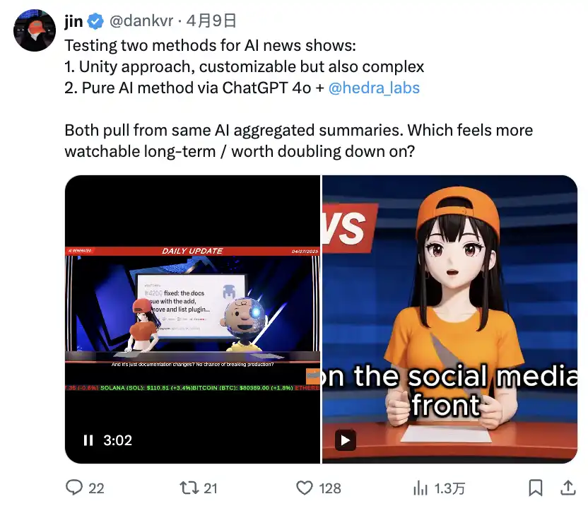 测试两种 AI 新闻节目方式: Unity 方法,可定制但也复杂 纯 AI 方法,通过 ChatGPT 4o + @hedra_labs两者都来自相同的 AI 聚合摘要。哪种长期更具可看性/值得加倍投入?