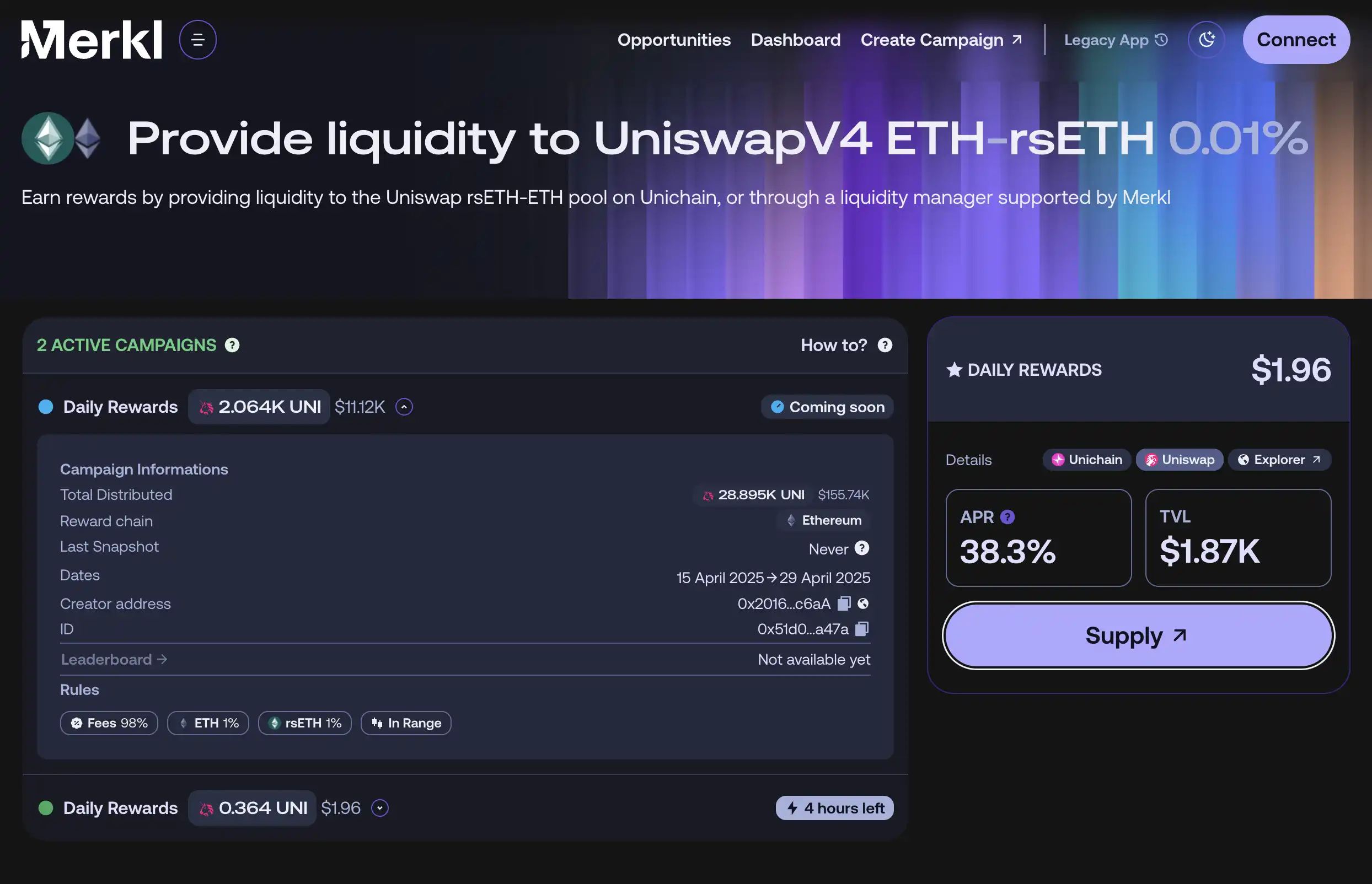 此次活动中,Gauntlet、Merkl 发挥着很大的作用,Gauntlet 是一个用于链上风险管理的模拟平台,利用基于代理的模拟来调整协议的关键参数,从而提高资本效率、费用、风险和激励。Merkl 则是由 a16z 孵化,集成了多条链以及协议的 DeFi 投资机会的一站式平台。