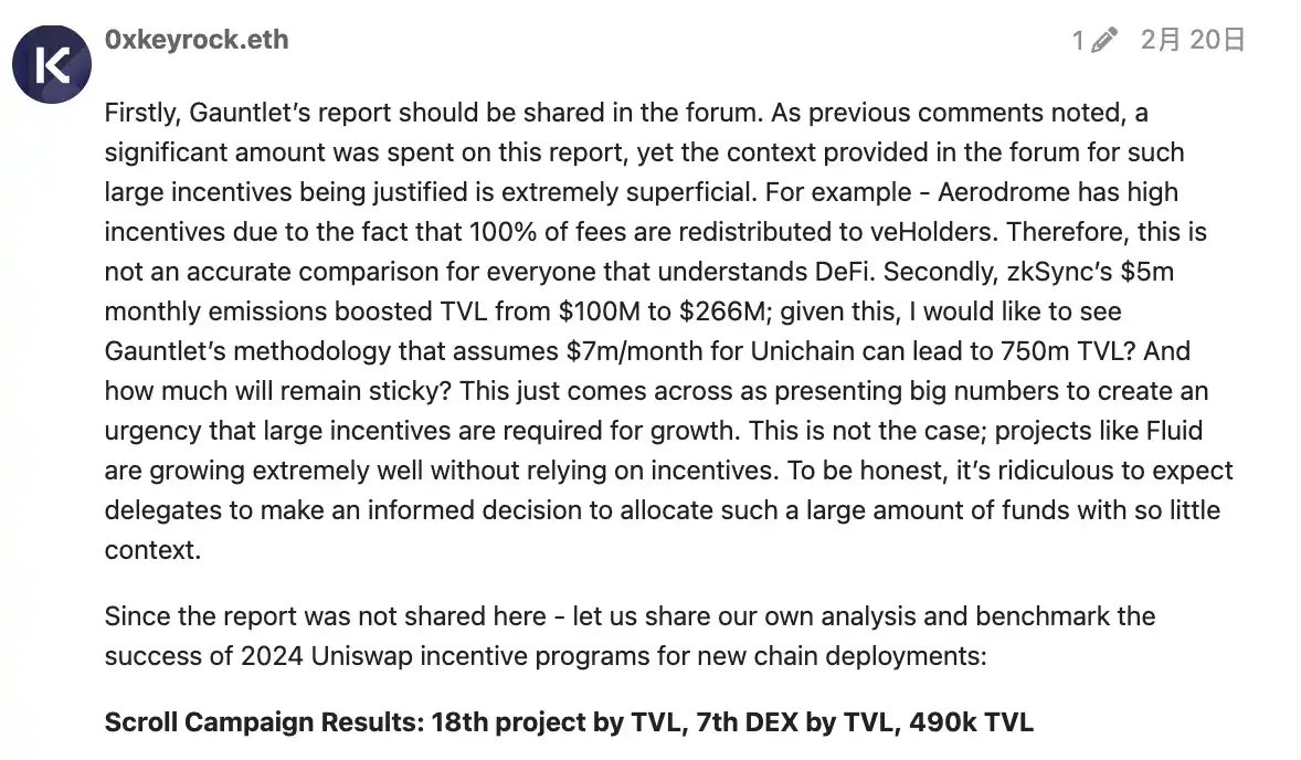 成员「0xkeyrock.eth」也有相同的担忧,他认为 Gauntlet 的报告应在论坛中公开分享。这份报告花费了大量资金,但在论坛中展现的信息却十分肤浅,不足以支撑如此大规模激励的合理性。