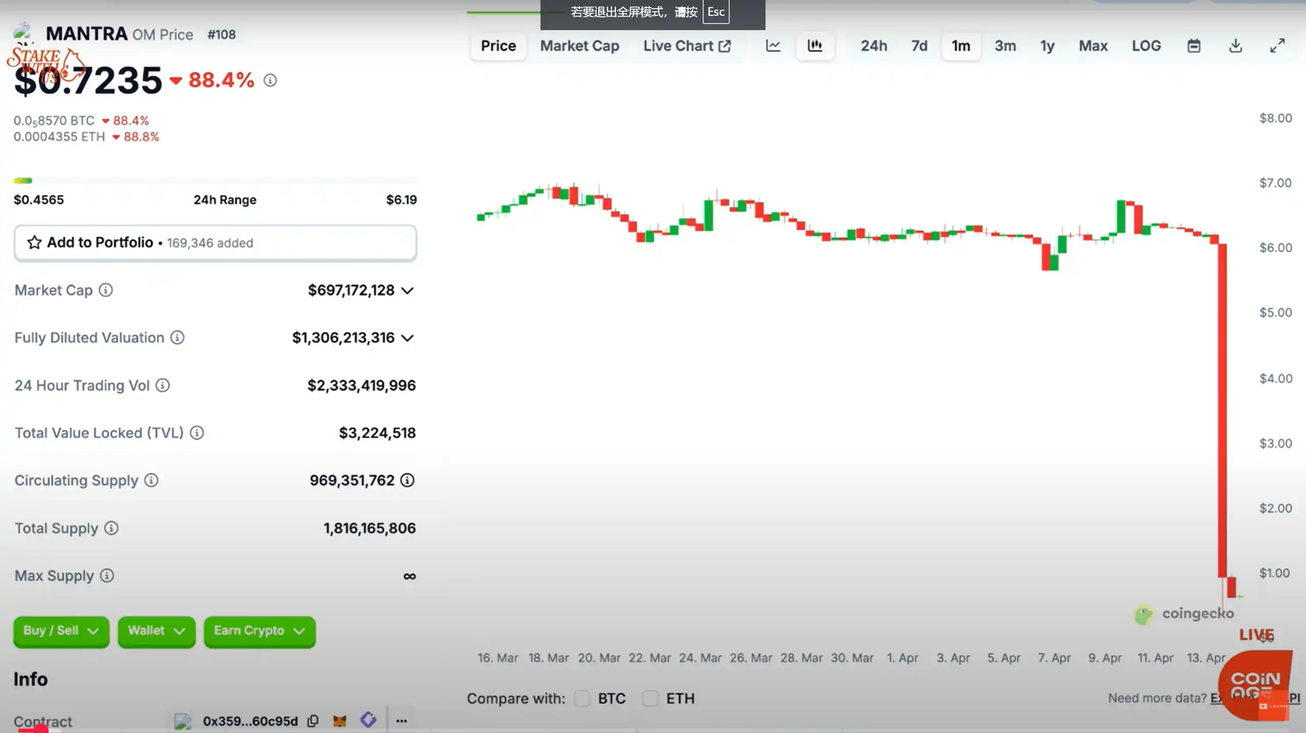 我们现在看到的图表显示,OM 代币在一天之内暴跌了超过 80%,市值蒸发了大约 50 亿美元(至少是账面上的)。
