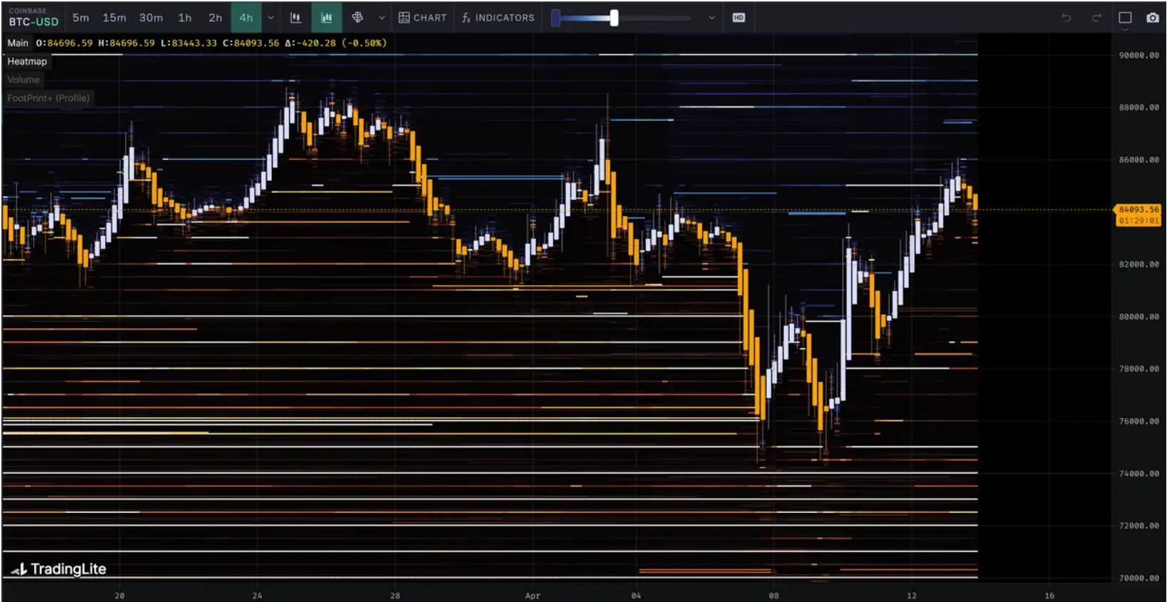 观察筹码分布图,在约 80000 附近有⼤量筹码成交,将有⼀定的⽀撑或压⼒。