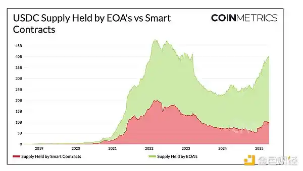 将智能合约中持有的供应量与外部拥有账户 (EOA) 中的供应量分开来看,可以揭示 USDC 在以太坊上的用户钱包和应用程序中的分布情况。目前,约 300 亿美元由 EOA 持有,增长了 66%,而约 100 亿美元位于智能合约中,较一年前增长了约 42%。EOA 余额的增长可能反映了交易平台托管和个人用户持有量的增加,而智能合约的增长则表明 USDC 作为 DeFi 借贷市场抵押品和去中心化交易平台 (DEX) 流动性来源的效用。