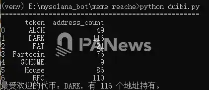 其次,就是 RFC 的重复出现次数最多,达到了 110 次。Fartcoin 近期的市场关注度较高,且市值也是这几个分析的代币最高的,但重复出现的次数只有 76 次。不过,据 PANews 分析,造成这个的原因可能是源于 Fartcoin 的市值已经在拉升至一个较高的水平,有不少持仓的大户已经撤离或者换车。由于无法追踪到具体某个时间的大户历史信息,我们目前也无法得出一个明确的答案。