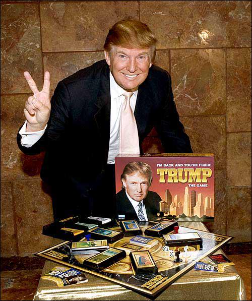 1989 年 5 月,唐纳德·特朗普与老牌棋盘游戏公司米尔顿·布拉德利合作推出桌游《特朗普:游戏》(Trump: The Game),设计灵感源自《大富翁》和特朗普本人的房地产大亨生涯。时任米尔顿·布拉德利公司总裁的 Milton Bradley 曾表示,该游戏以高风险赌局、交易以及特朗普于 1987 年推出的畅销书《交易的艺术》(The Art of the Deal)作为背景。特朗普还为游戏拍摄电视广告,并打出了「重要的不是输赢,而是赢不赢!」的宣传口号。