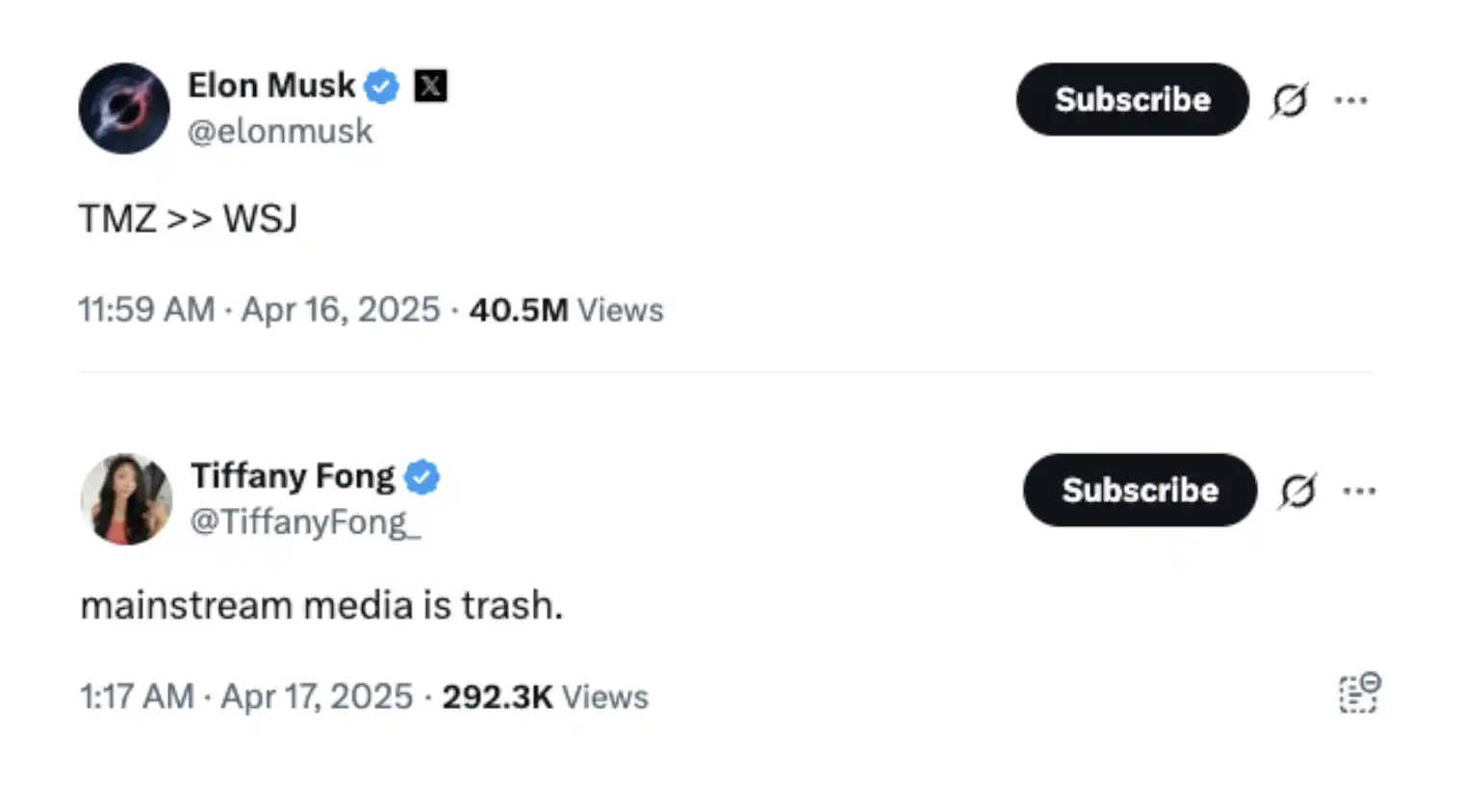 此后的几个月时间里,马斯克经常出现在 Tiffany 的 Twitter 评论区,直到最近的绯闻,让两人不约而同骂起了主流媒体。