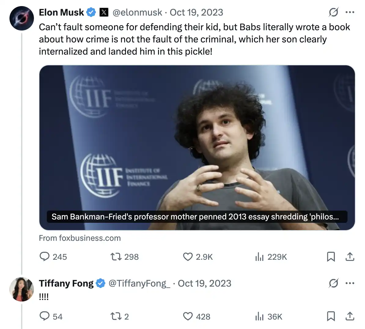 要说 Tiffany 与马斯克如何搭上关系,还得回到 2023 年十月 SBF 的庭审现场。彼时庭审刚刚结束,SBF 的父母准备离场,Tiffany 看到二位老人本想上前安慰一番,没想到 SBF 的母亲 Barbara Fried 对着 Tiffany 情绪激动的大喊大叫起来,称 Tiffany 的报道害了 SBF。