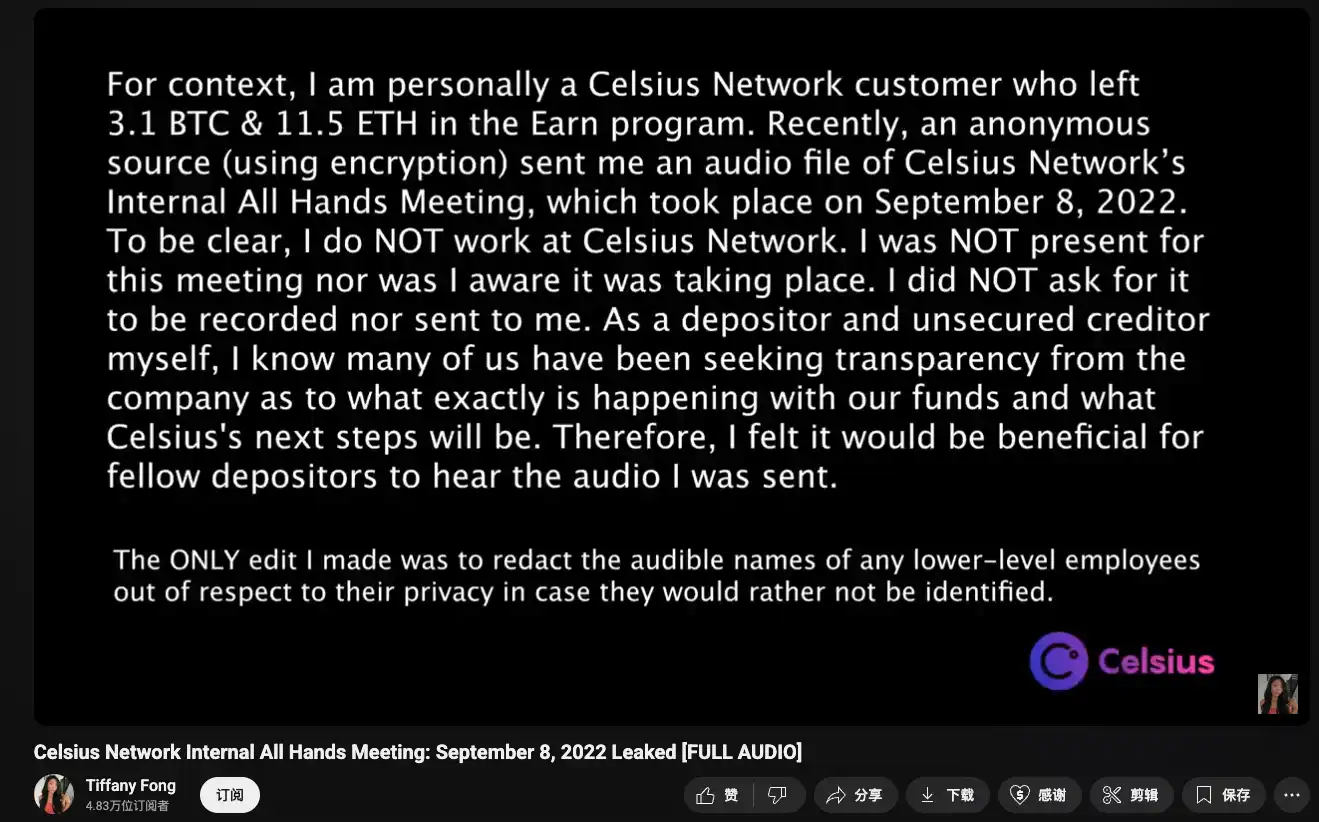 Tiffany 起初对这段音频将信将疑,但在反复确认内容和录音中确实出现了当时公司 CEO Alex Mashinsky 的声音后,她意识到这段材料的重要性,她决定将录音提供给《纽约时报》,随后该媒体对此进行了深度报道。