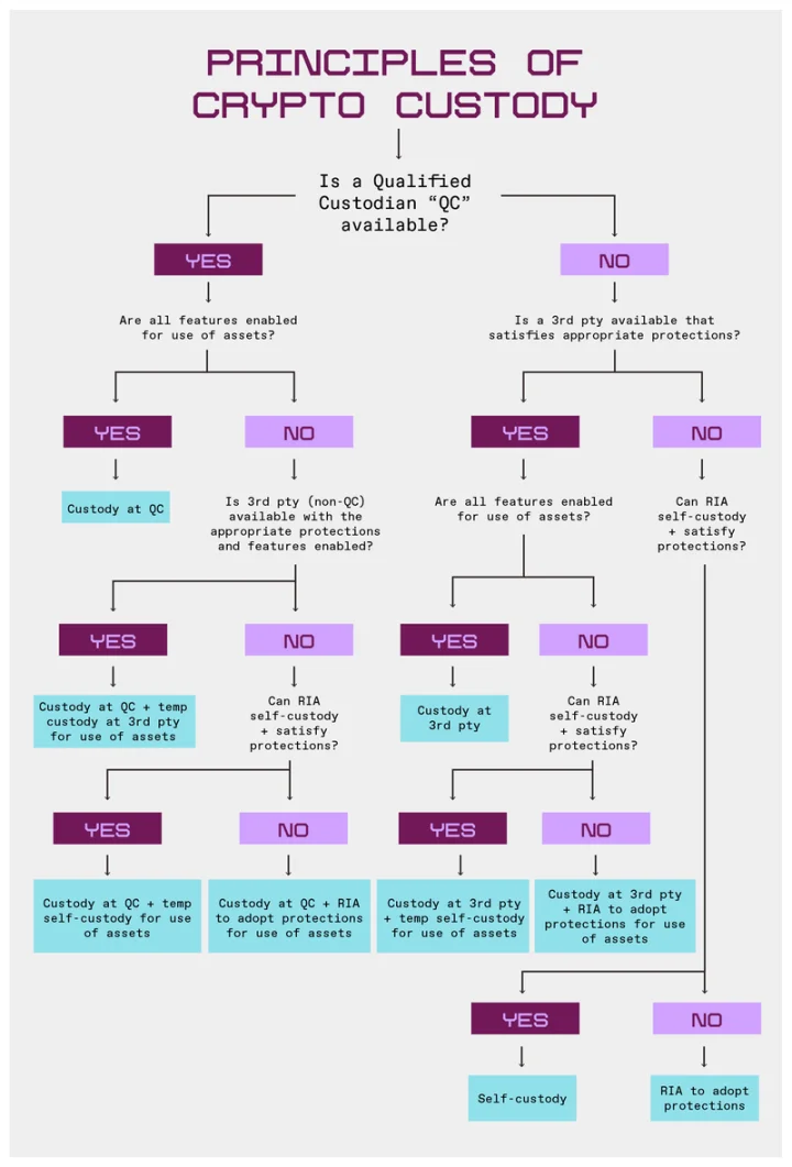 我们在此提出的原则旨在为 RIAs 揭开托管的神秘面纱,同时保留其保护客户资产的责任。目前专注于加密资产的合格托管人(如银行或经纪自营商)市场极其狭小;因此,我们的主要关注点在于托管实体是否有能力提供我们认为托管加密资产所必需的实质性保护措施,而不仅仅是该实体作为《投资顾问法》下合格托管人的法律地位。