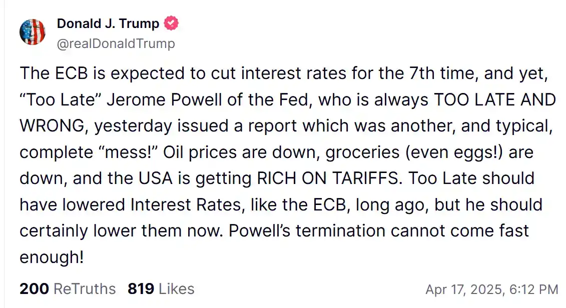 特朗普从不掩饰对鲍威尔的失望。2025 年 4 月 17 日,他在椭圆形办公室对记者放话:「如果我想让他走,相信我,他很快就会走!」随后,他在 Truth Social 再度发文催促美联储主席鲍威尔降息,「欧洲央行即将第七次降息,而美联储的「永远迟到先生」鲍威尔再次搞砸了一切。昨日他又抛出一份典型的混乱报告——油价在跌、食品价格在下跌,连鸡蛋都在降价,美国正通过关税大赚特赚。这个「慢半拍」早该像欧洲央行那样降息,现在更是刻不容缓,鲍威尔的下台倒计时该加快了!」