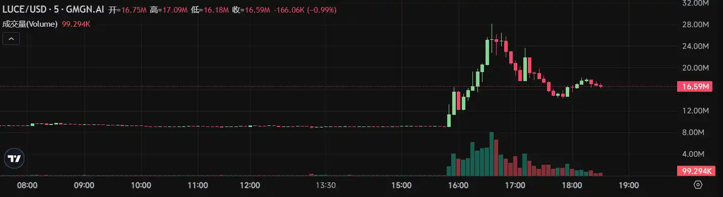 消息发布后,LUCE 短时间内迅速上涨,市值在 45 分钟内从 9.08M 美元上升到 28.19M 美元,涨幅高达 210.46%。但由于缺乏后继增长动力,市值在达到最高点后一路回落,目前在 16M 美元左右。