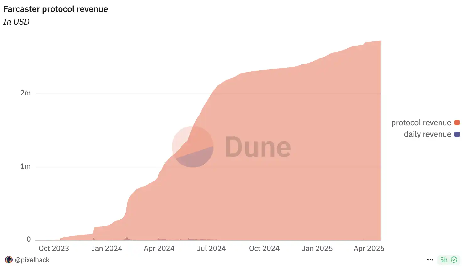 根据官方文档,用户在使用 Warpcast Wallet 时需支付 0.85% 的手续费,其中 0.15% 归提供交易路由的 0x 协议,0.70% 则直接计入 Warpcast 收入。Dune 数据显示,自上线以来,Farcaster 协议的营收曲线持续增长,初步验证了内嵌钱包作为商业化路径的可行性。