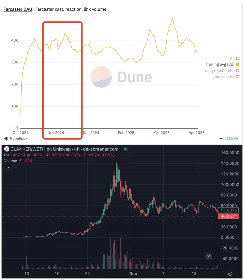Clanker 是 Warpcast 上的一个代币发行 AI Agent,用户发帖并艾特 Clanker 就可以在 Uniswap 发布可交易代币,其官方代币$CLANKER 在去年 11 月暴涨 20 倍,使 Base 以及 Warpcast 成为同 Solana 在 AI 概念赛道的竞争者。也因为$CLANKER 的造富效应,Farcaster 的日活用户突破去年夏季以来的新高。